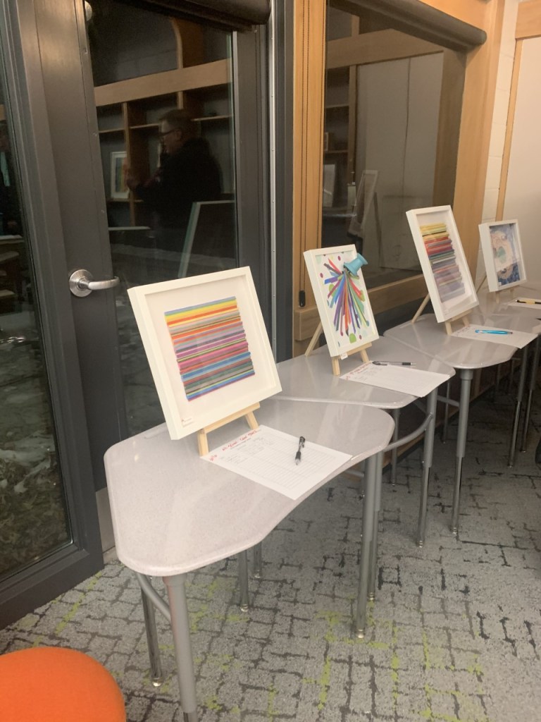 Art pieces were made by individual students and collaborative pieces made by grade level were also featured. These pieces were auctioned off along with raffle baskets. The gallery night also featured free art-based activities for kids of all ages.