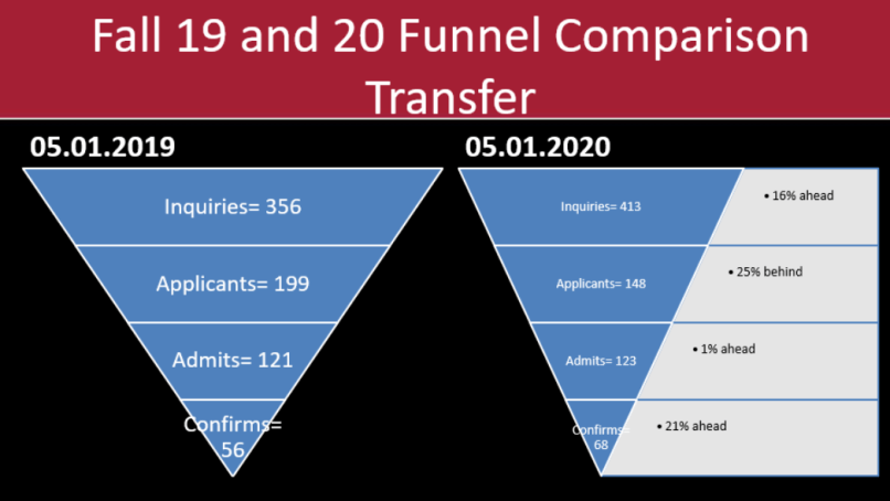Though the current transfer numbers are stronger than 2019’s, during College Assembly on May 11, Schultz said transfer student enrollment has been affected by the pandemic. She said she hopes to see an increase in transfer applications.