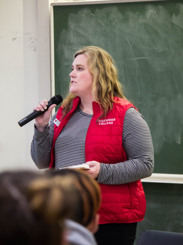 Student Senate President Sydney Wilcox began the forum by praising Edgewood students for demonstrating the college values of truth, justice, partnership, community and compassion.