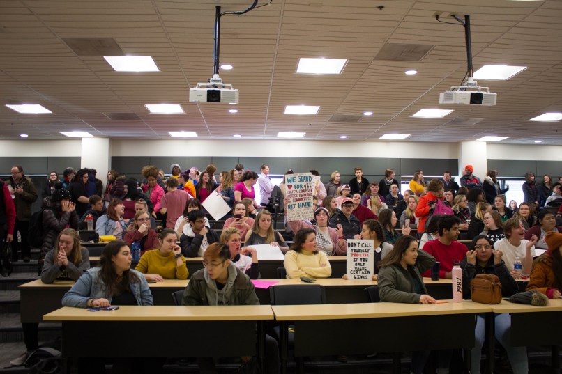 Students protest in the atrium of Predolin after the forum. Photo by Jena Emmert.