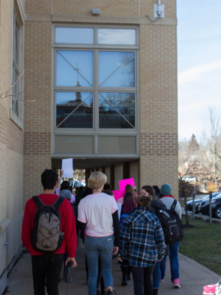 They marched, holding signs in support of Planned Parenthood and calling out administration, from the Sonderegger Science Center to the president’s office. The office appeared to be empty, the lights off and no one around. Gevelinger’s office door was closed.
