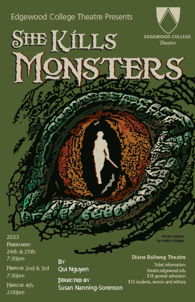 Edgewood College’s Diane Ballweg Theatre will open “She Kills Monsters” on Friday. Show dates are February 24-25 at 7:30 p.m., March 2-3 at 7:30 p.m., and March 4 at 2:00 p.m.