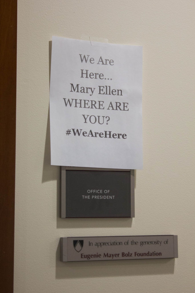 An anonymous student made copies of this message and students hung them around campus. This photo is from the door to the president’s office. Photo by Jena Emmert.