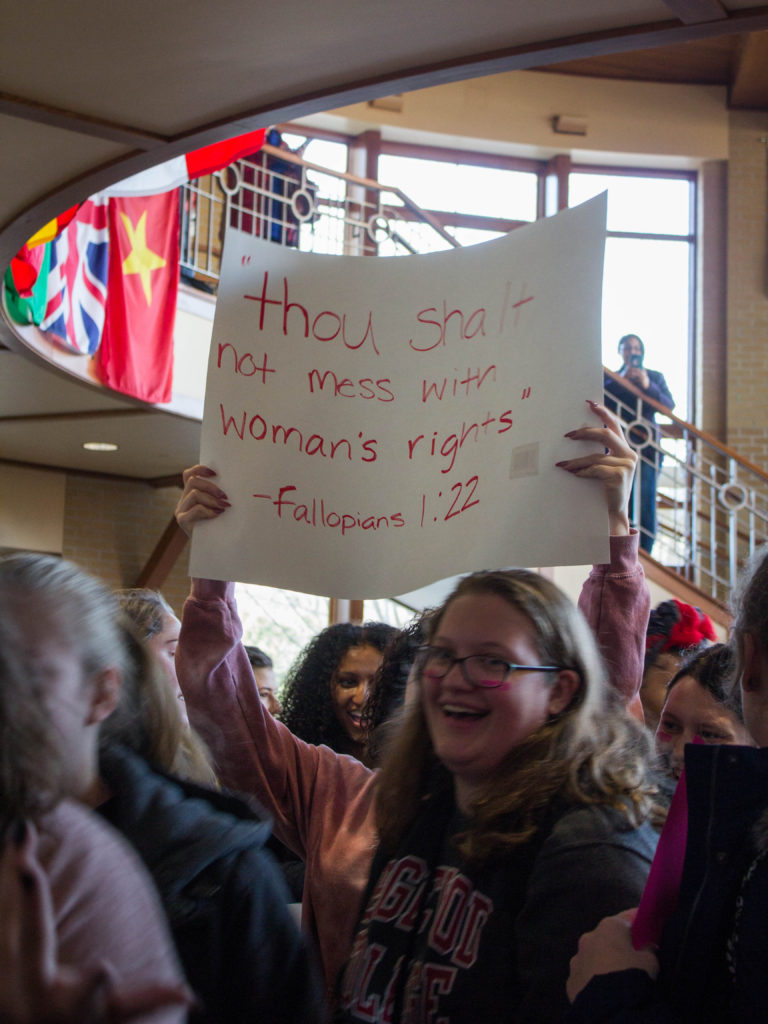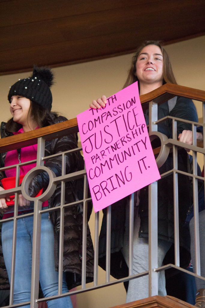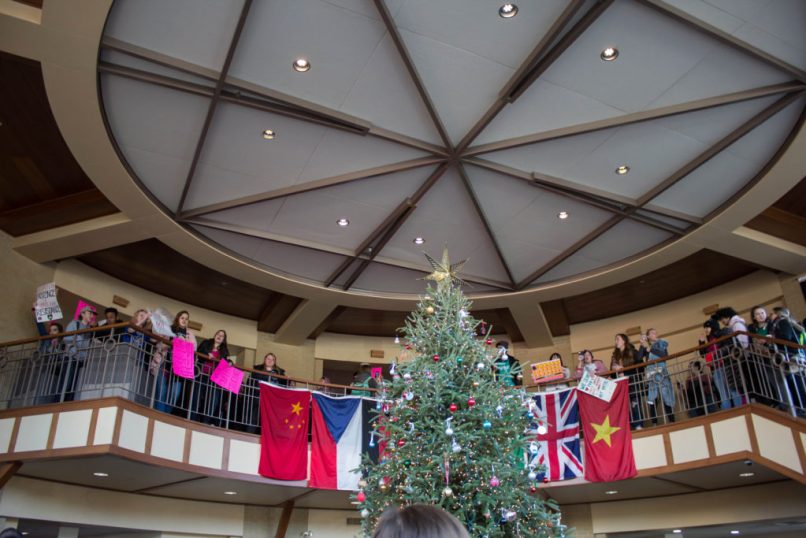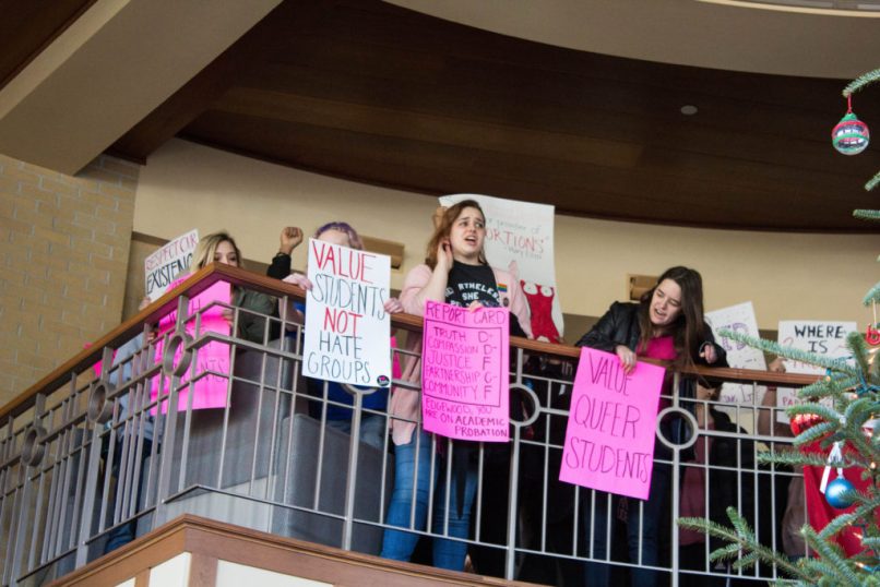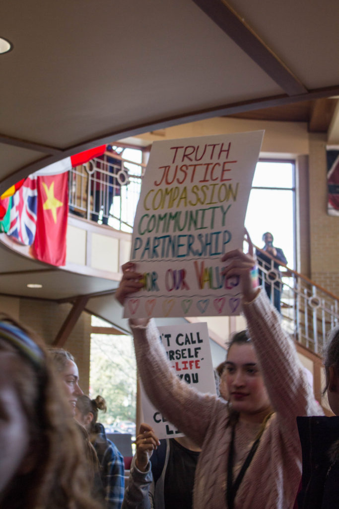 Students protest in the atrium of Predolin after the forum. Photo by Jena Emmert.