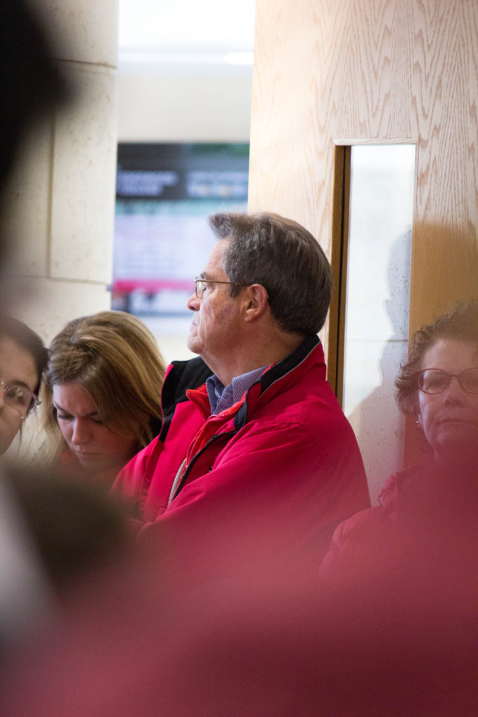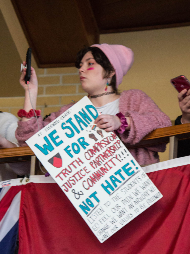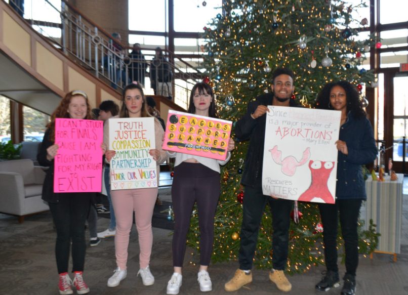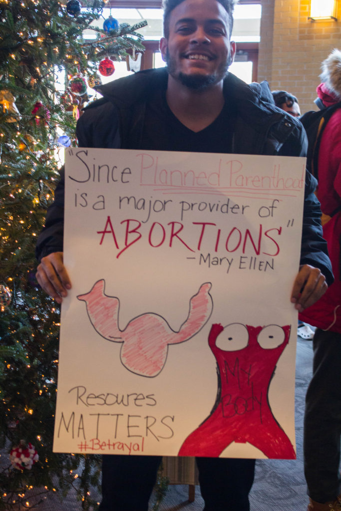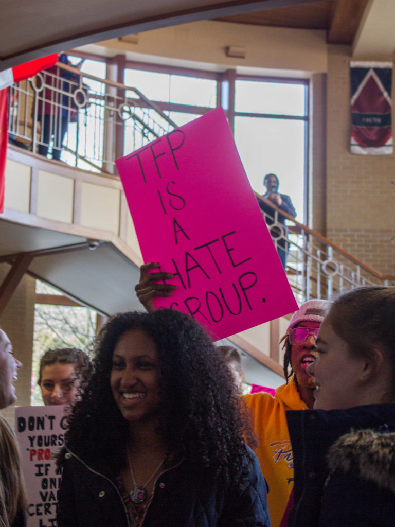 Students protest in the atrium of Predolin after the forum. Photo by Jena Emmert.