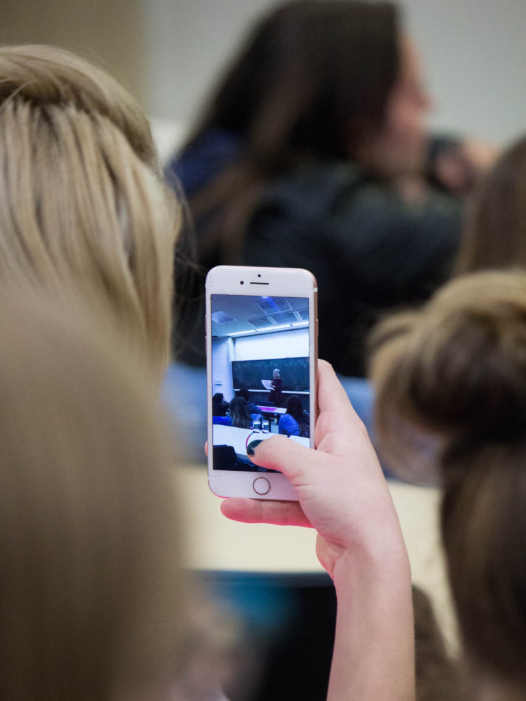 Student livestreams forum on Friday Dec. 6. Photo by Jena Emmert.