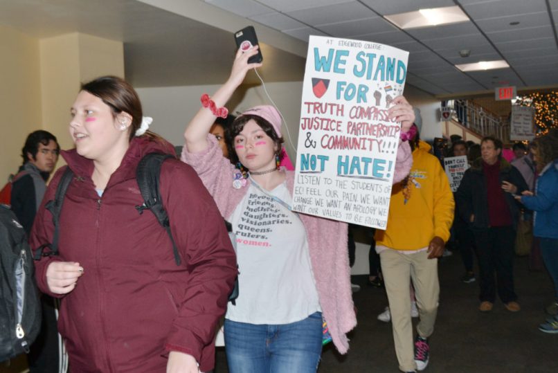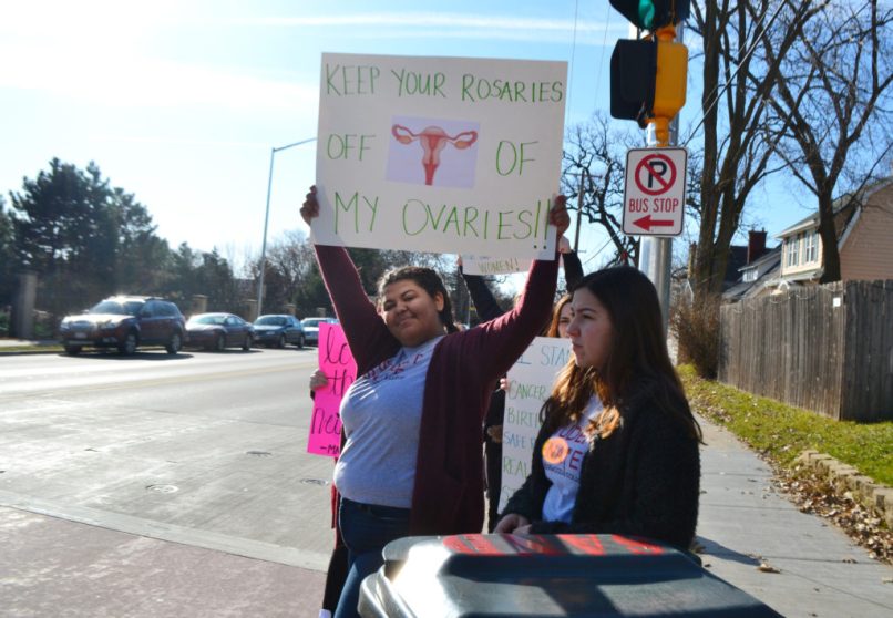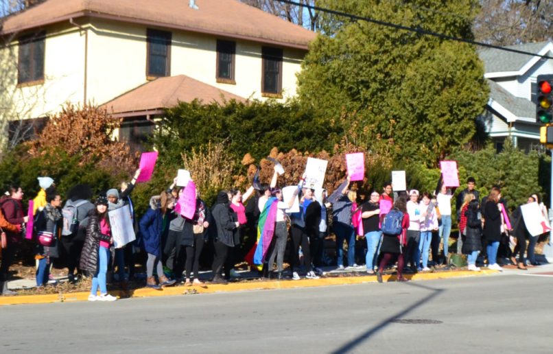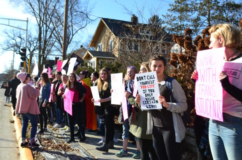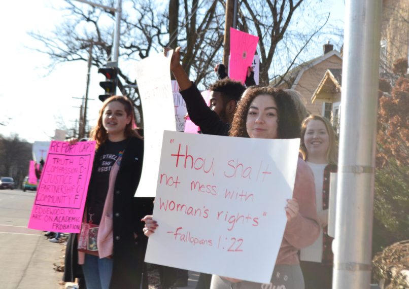 Students protest on Monroe Street outside of Edgewood College. Photo by Robin Gee.