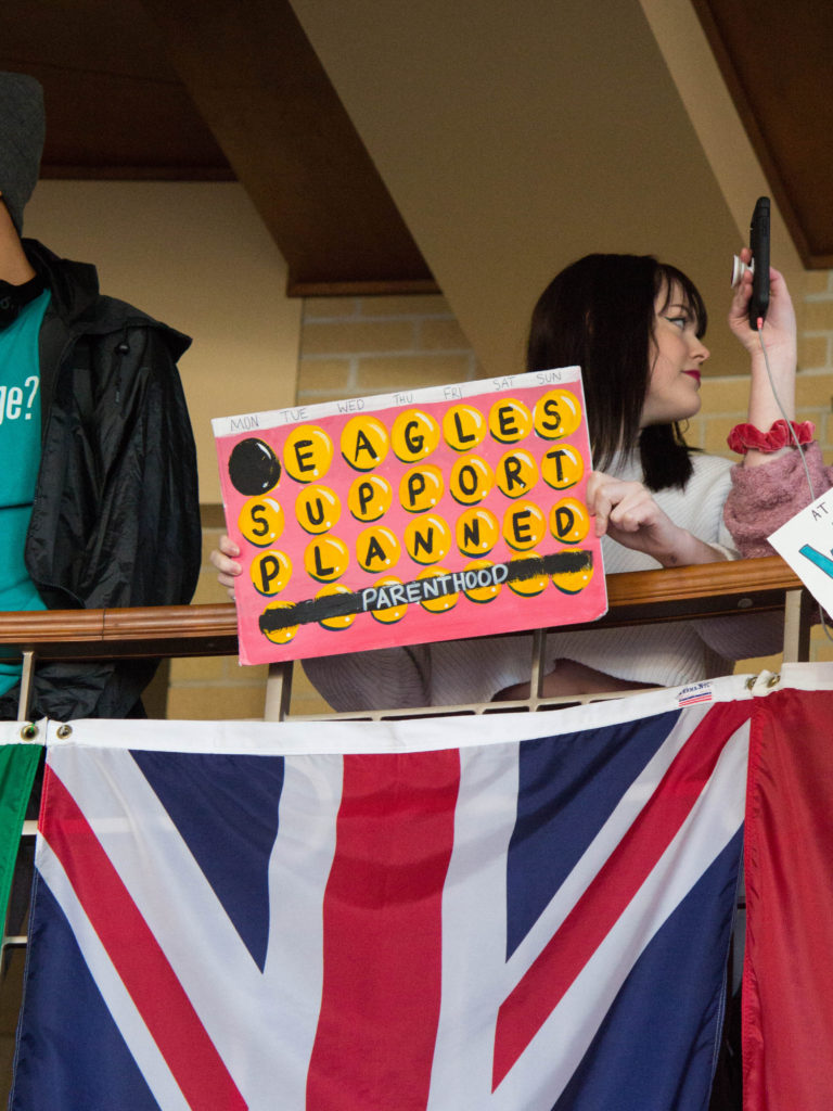 Edgewood College choir with their folders and Planned Parenthood stickers.