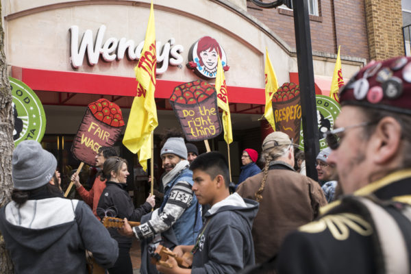 Dozens of people gathered in front of Wendy’s restaurant on State Street in Madison on Tuesday March 22 to promote a boycott for fair food.